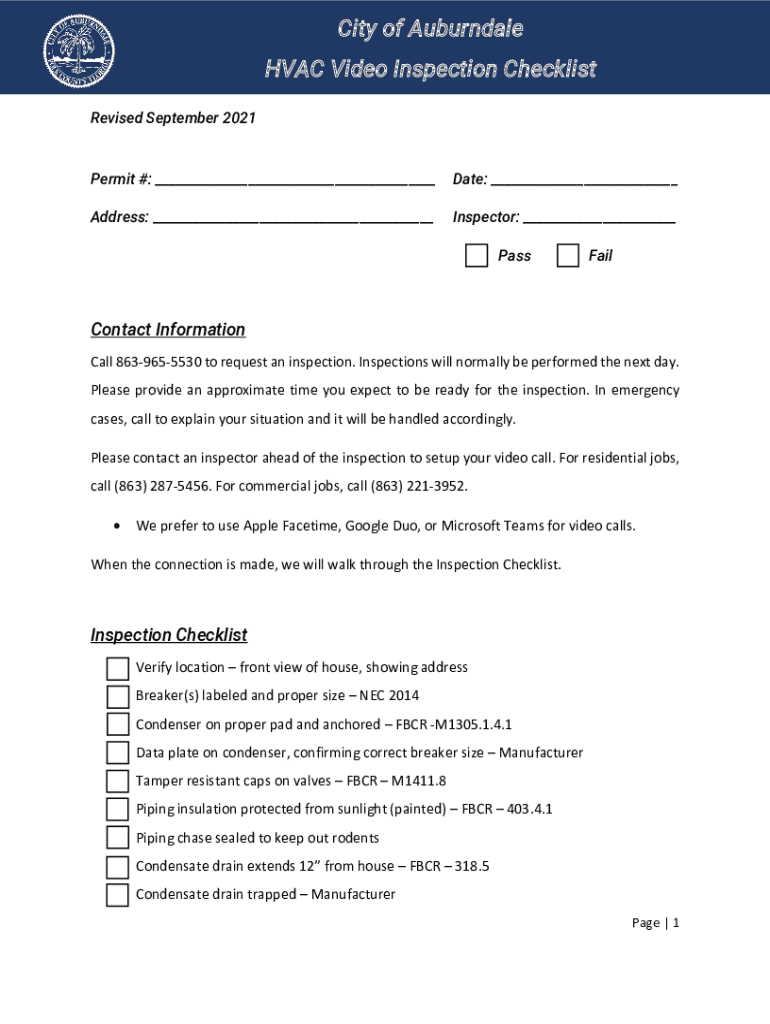 City of Auburn dale HVAC Video Inspection Checklist Revised September 2021Permit #: ___Date: ___Address: ___Inspector: ___ PassFailContact Information Call 8639655530 to request an inspection. Inspections