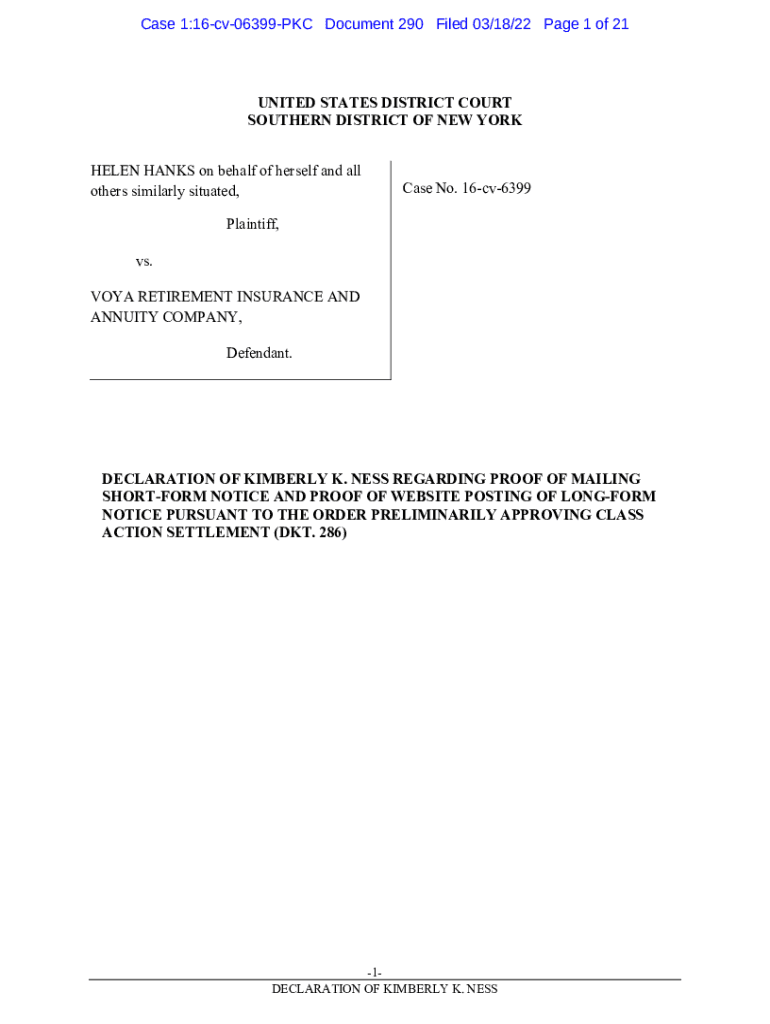 Case 1:16cv06399PKC Document 290 Filed 03/18/22-Page 1 of 21UNITED STATES DISTRICT COURT SOUTHERN DISTRICT OF NEW YORK HELEN HANKS on behalf of herself and all others similarly situated, Case No.