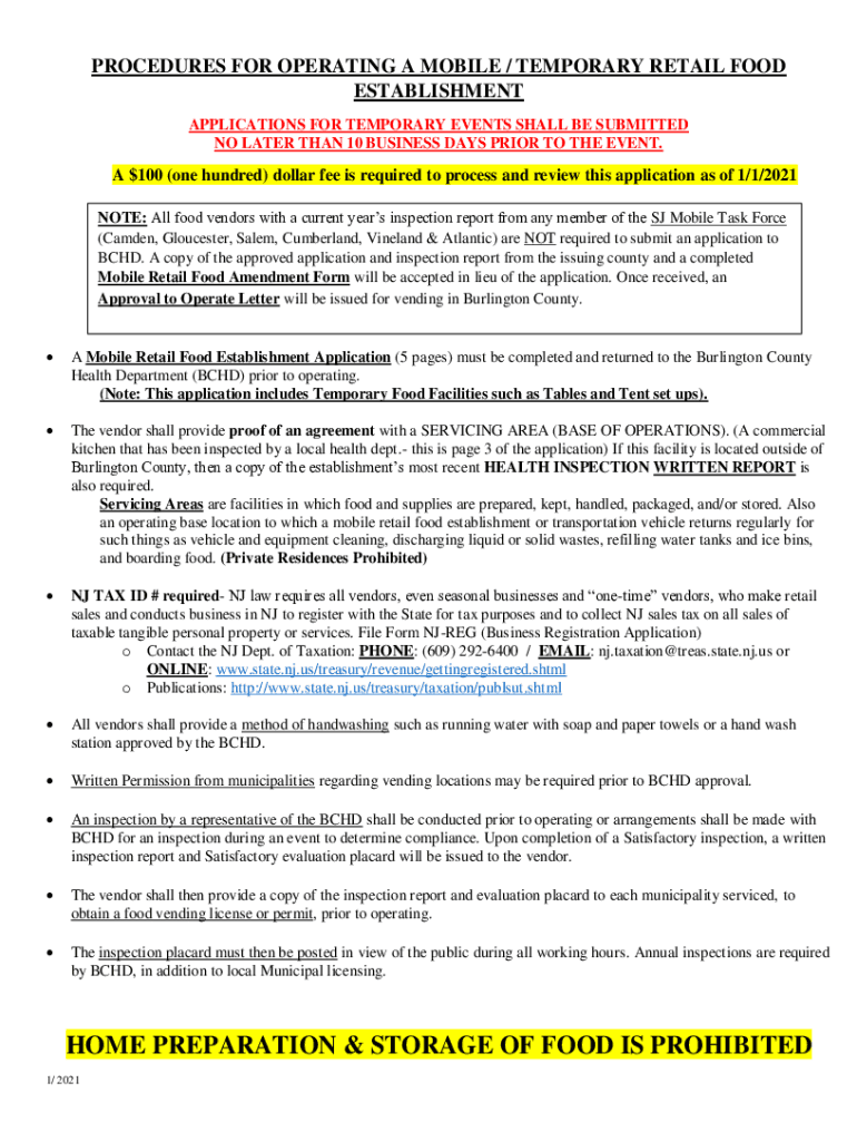 PROCEDURES FOR OPERATING A MOBILE / TEMPORARY RETAIL FOOD ESTABLISHMENT APPLICATIONS FOR TEMPORARY EVENTS SHALL BE SUBMITTED NO LATER THAN 10 BUSINESS DAYS PRIOR TO THE EVENT. A $100 (one hundred)