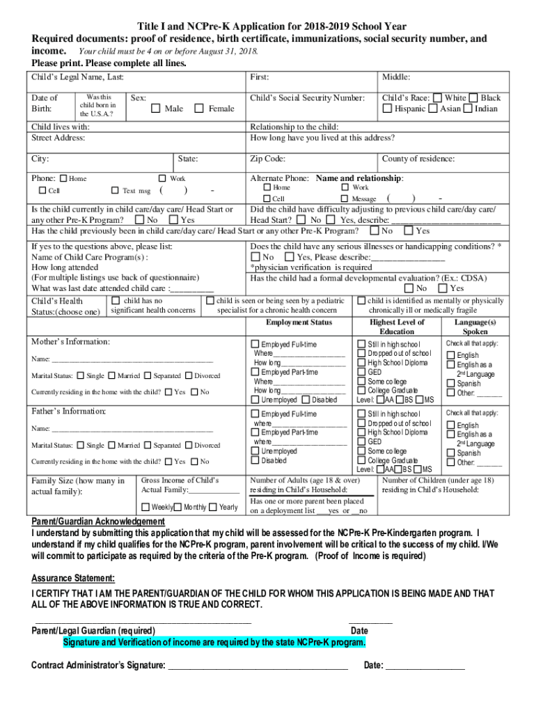 Title I and Care Application for 20182019 School Year Required documents: proof of residence, birth certificate, immunizations, social security number, and income. Your child must be 4 on or before