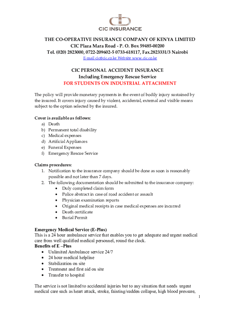 THE COOPERATIVE INSURANCE COMPANY OF KENYA LIMITED CIC Plaza Mara Road P. O. Box 5948500200 Tel. (020) 2823000, 07222096025 0733618117, Fax.2823331/3 Nairobi Email cic@cic.co.ke Website www.cic.co.keCIC