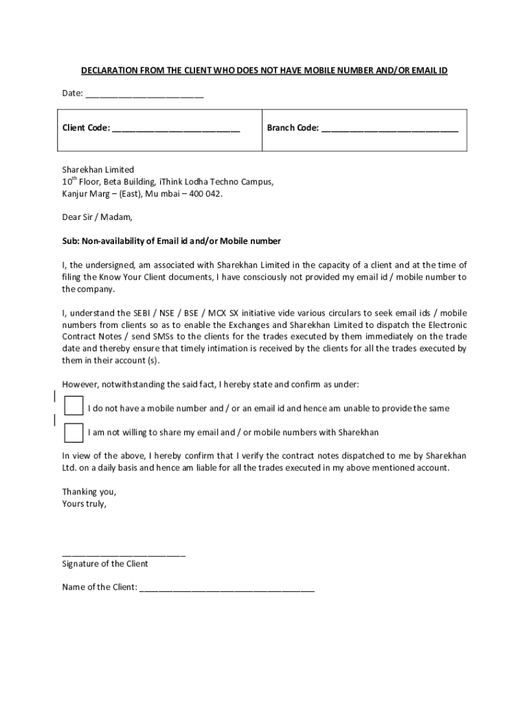 DECLARATION FROM THE CLIENT WHO DOES NOT HAVE MOBILE NUMBER AND/OR EMAIL ID Date: ___Client Code: ___Branch Code: ___Share khan Limited 10th Floor, Beta Building, think ODHA Techno Campus, Kanpur