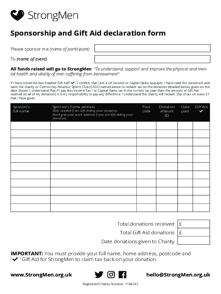 Sponsorship and Gift Aid declaration form Please sponsor me (name of participant) To (name of event) All funds raised will go to Strongmen: To understand, support and improve the physical and mental