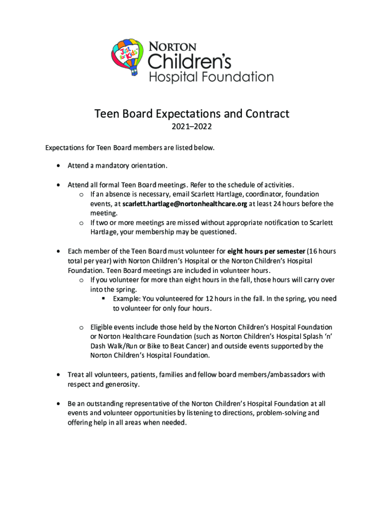 Teen Board Expectations and Contract 20212022Expectations for Teen Board members are listed below. Attend a mandatory orientation. Attend all formal Teen Board meetings. Refer to the schedule of activities.