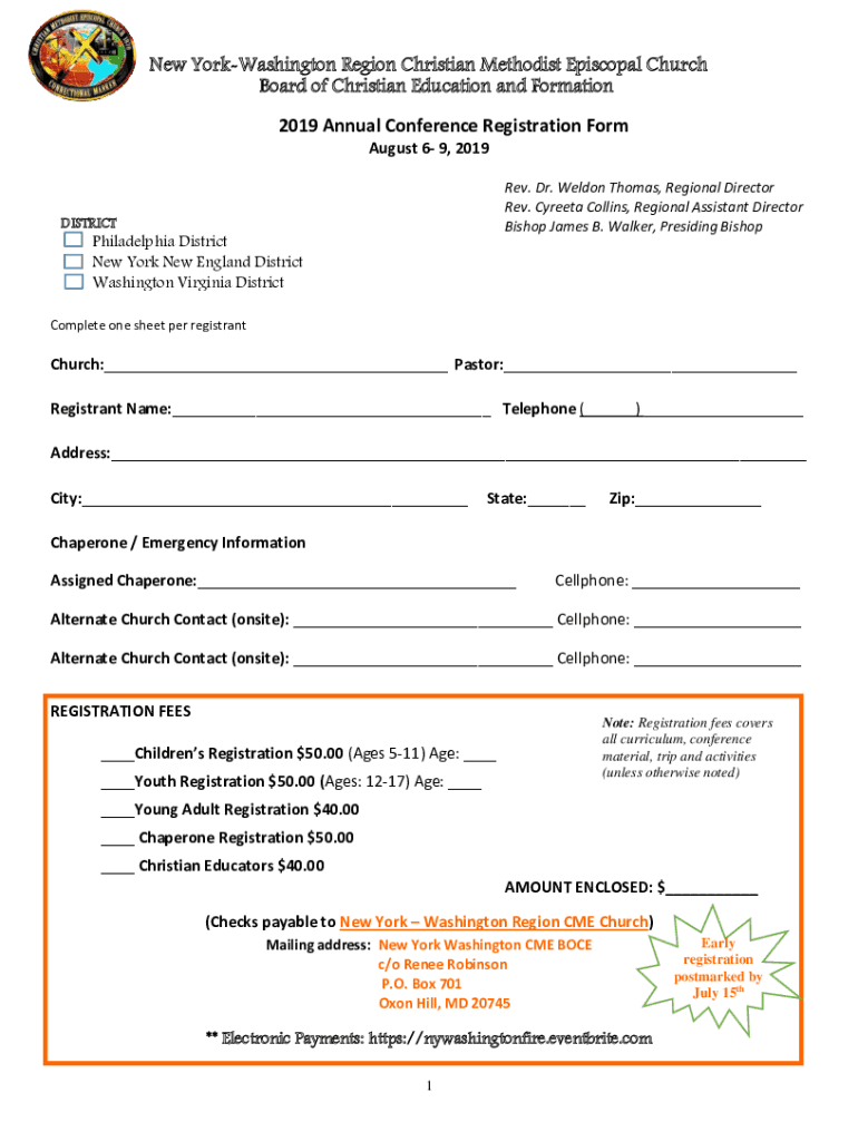 New York Washington Region Christian Methodist Episcopal Church Board of Christian Education and Formation 2019 Annual Conference Registration Form August 6 9, 2019 Rev. Dr. Weldon Thomas, Regional