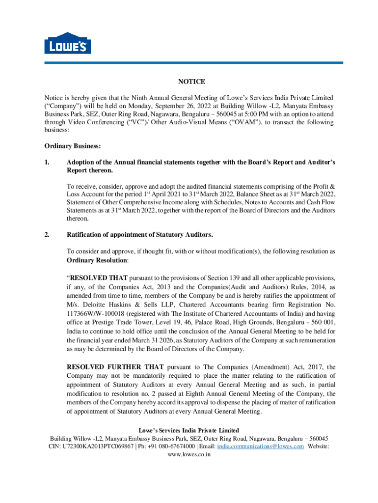 NOTICE is hereby given that the Ninth Annual General Meeting of Lowes Services India Private Limited