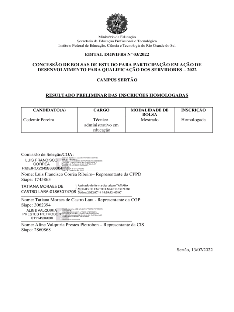 Institute Federal de Educao, India e Technology do Rio Grande do Sundial DGP/IFRS N 03/2022