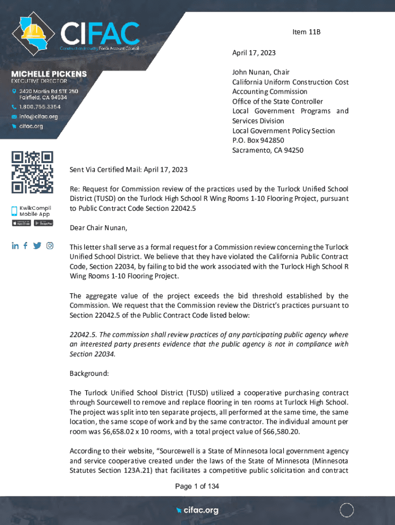 Item 11B April 17, 2023, John Hunan, Chair California Uniform Construction Cost Accounting Commission Office of the State Controller Local Government Programs and Services Division Local Government