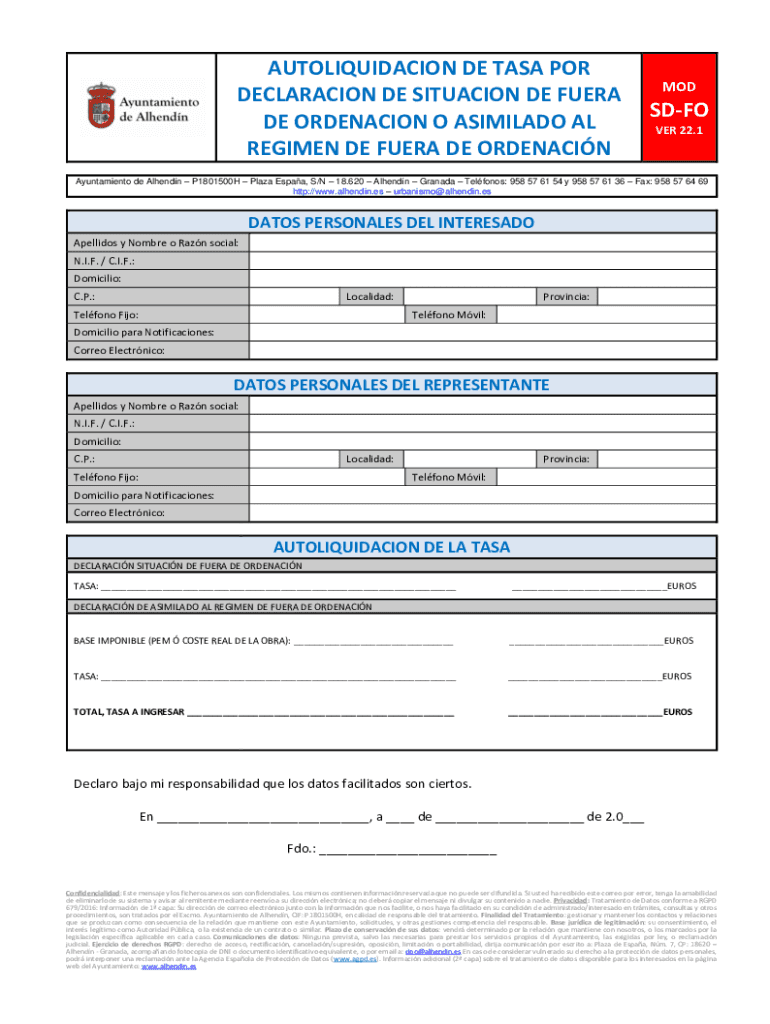 AUTOLIQUIDACION DE TASK POR DECLARATION DE SITUATION DE ERA DE ORDINATION O SIMILAR AL REGIMEN DE ERA DE ORDENACINMODSDFO VERY 22.1Ayuntamiento de Allende P1801500H Plaza ESAA, S/N 18.620 Allende