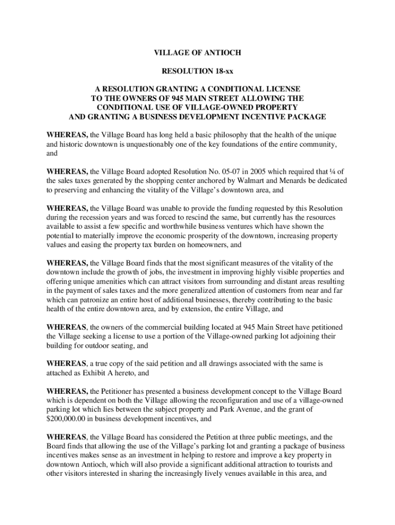 VILLAGE OF ANTIOCH RESOLUTION 18xx A RESOLUTION GRANTING A CONDITIONAL LICENSE TO THE OWNERS OF 945 MAIN STREET ALLOWING THE CONDITIONAL USE OF VILLAGEOWNED PROPERTY AND GRANTING A BUSINESS DEVELOPMENT