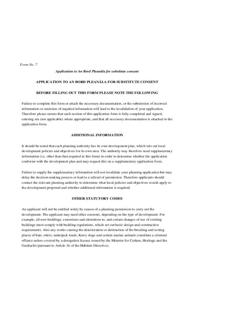 Form No. 7 Application to An Born Cleanly for substitute consent APPLICATION TO AN BORN CLEANLY FOR SUBSTITUTE CONSENT BEFORE FILLING OUT THIS FORM PLEASE NOTE THE FOLLOWING Failure to complete this