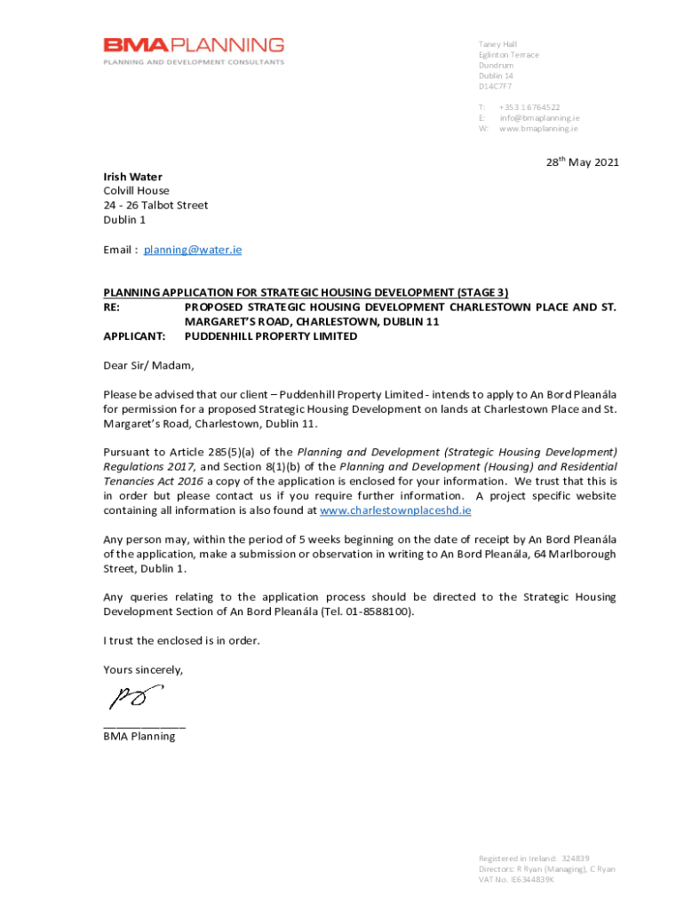 Taney Hall Clinton Terrace Don't drum Dublin 14 D14C7F7 T: E: W:+353 1 6764522 info@bmaplanning.ie www.bmaplanning.ie28th May 2021 Irish Water Colville House 24 26 Talbot Street Dublin 1 Email : planning@water.iePLANNING