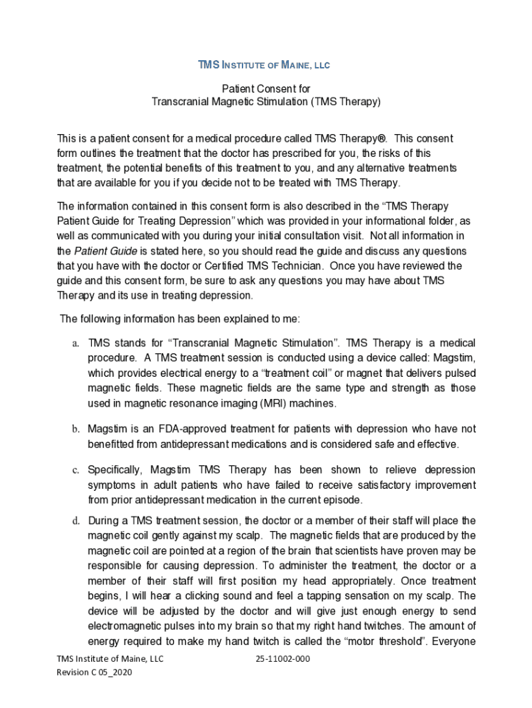 TMS INSTITUTE OF MAINE, LLC Patient Consent for Transcranial Magnetic Stimulation (TMS Therapy) This is a patient consent for a medical procedure called TMS Therapy. This consent form outlines the