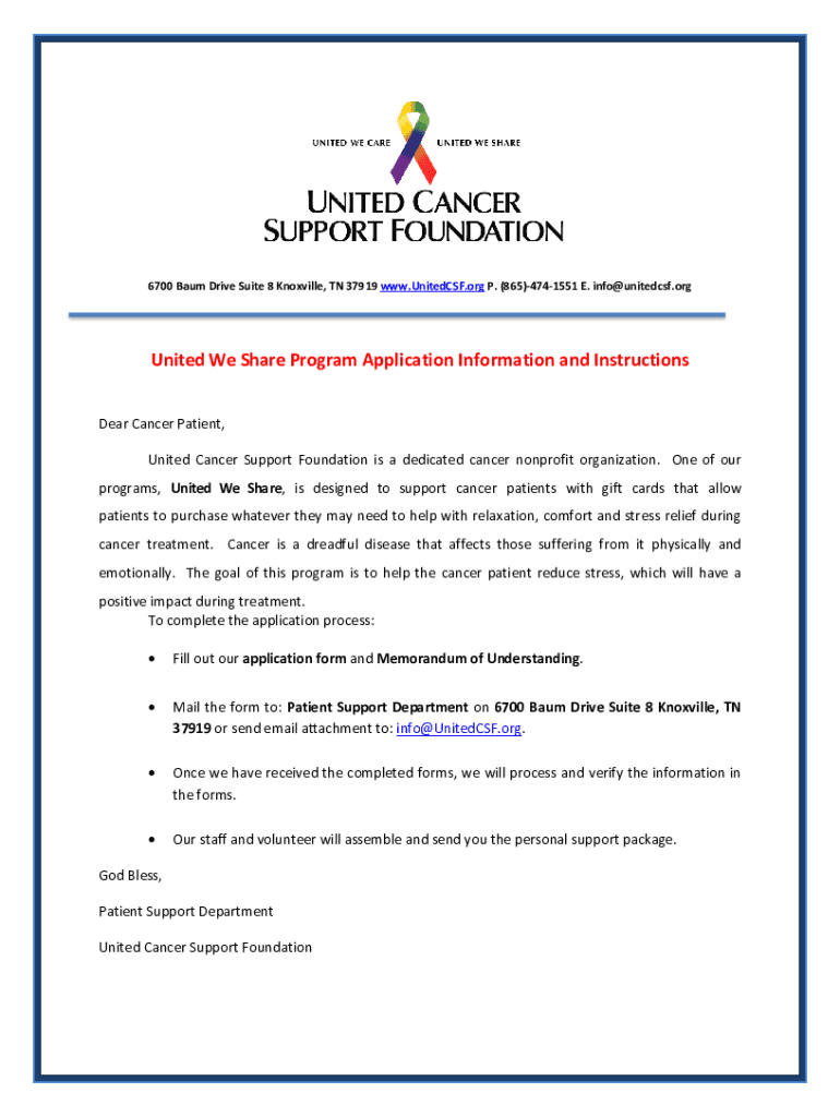 6700 Baum Drive Suite 8 Knoxville, TN 37919 www.UnitedCSF.org P. (865)4741551 E. info@unitedcsf.orgUnited We Share Program Application Information and Instructions Dear Cancer Patient, United Cancer