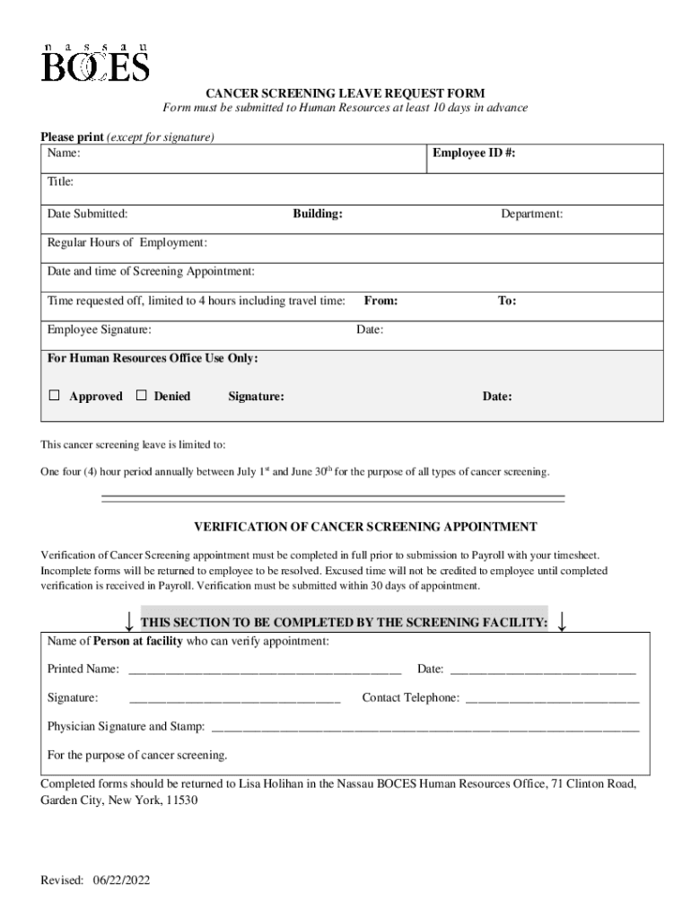 MEMO DEPARTMENT OF HUMAN RESOURCES To:All EmployeesFrom:Thomas M. McGrath, Executive Directorate:June 22, 2022Re:Cancer ScreeningCANCER SCREENING: All full and part-time Nassau BONES employees are