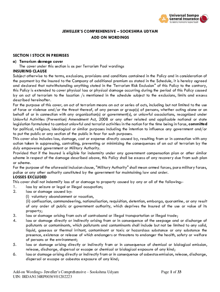 Jewelers COMPREHENSIVE BOOKSHOP ADAM ADD ON WORDINGSSECTION I STOCK IN PREMISES a) Terrorism damage cover The cover under this section is as per Terrorism Pool wordings INSURING CLAUSE Subject otherwise