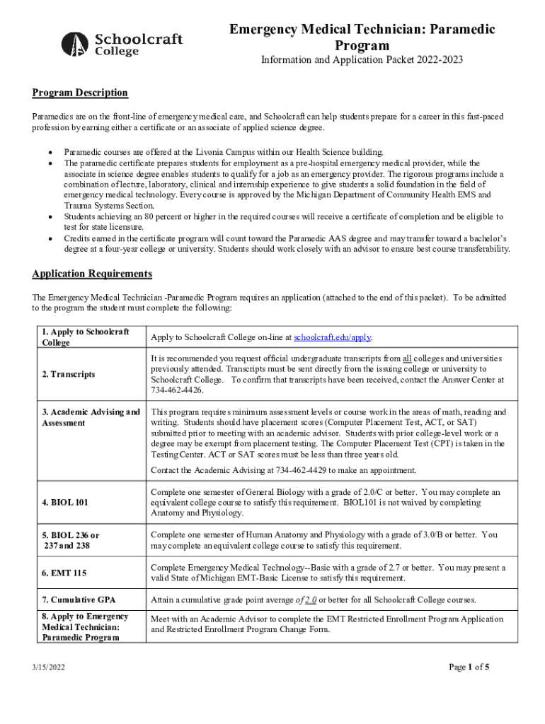 Emergency Medical Technician: Paramedic Program Information and Application Packet 20222023Program Description Paramedics are on the front line of emergency medical care, and School craft can help