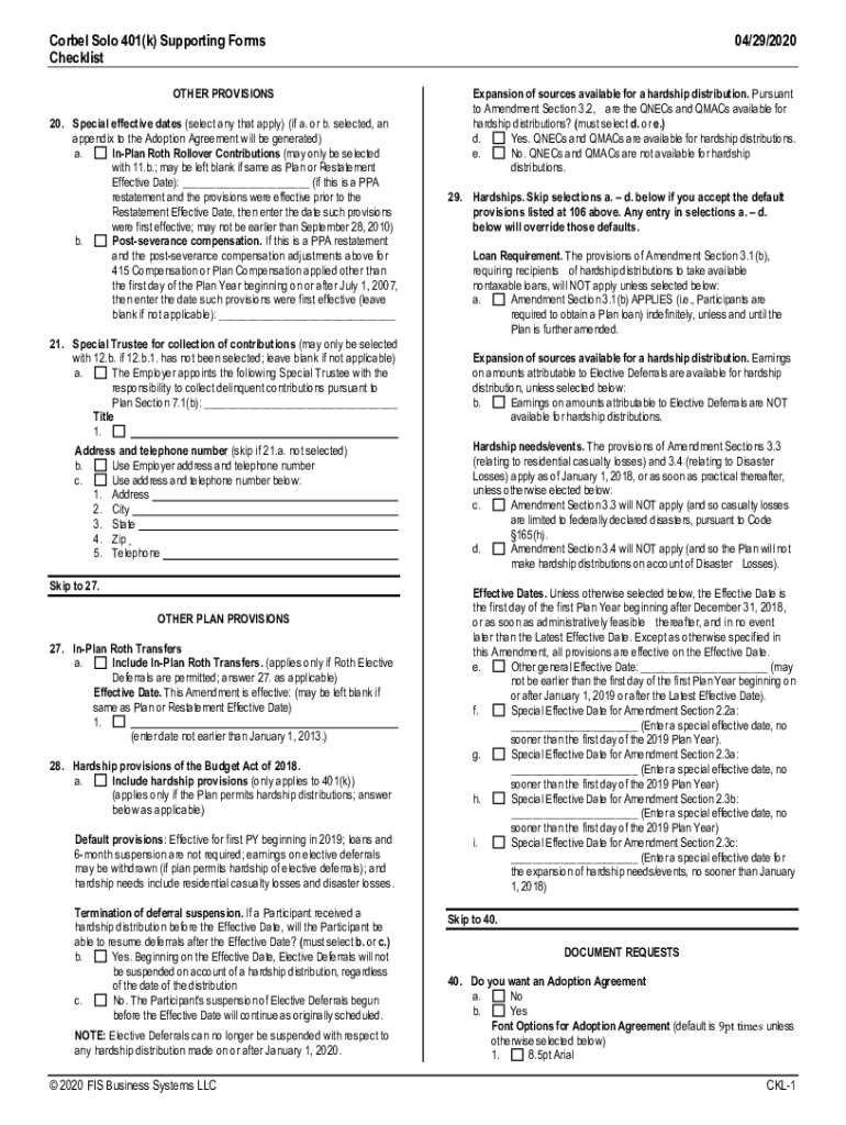 Corbel Solo 401(k) Supporting Forms Checklist OTHER PROVISIONS 20. Special effective dates (select any that apply) (if a. or b. selected, an appendix to the Adoption Agreement will be generated) a.