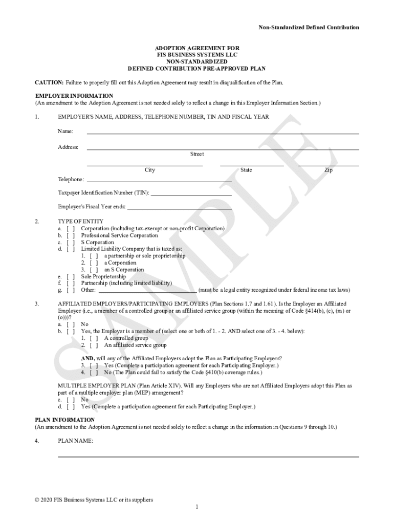 Unstandardized Defined Contribution ADOPTION AGREEMENT FOR IS BUSINESS SYSTEMS LLC UNSTANDARDIZED DEFINED CONTRIBUTION PREAPPROVED PLAN CAUTION: Failure to properly fill out this Adoption Agreement