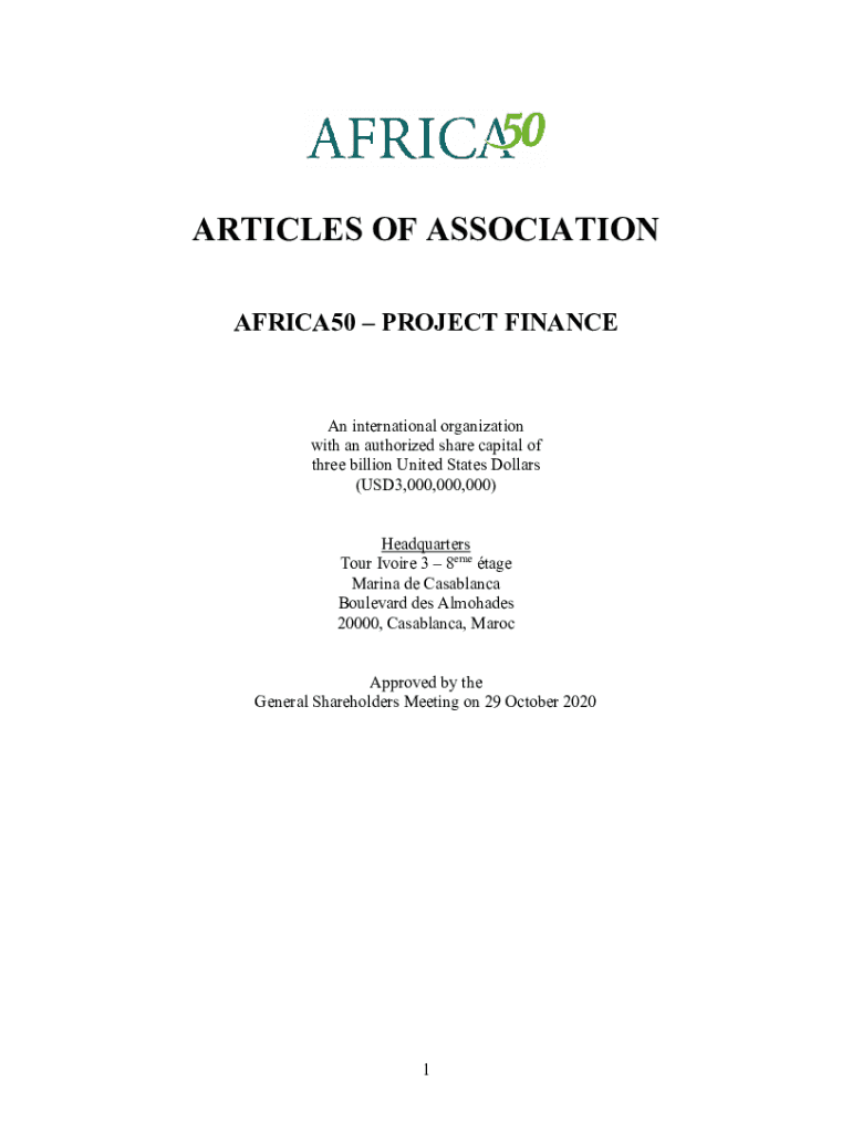 ARTICLES OF ASSOCIATION AFRICA50 PROJECT Financial international organization with an authorized share capital of three billion United States Dollars (USD3,000,000,000) Headquarters Tour Voice 3 8eme