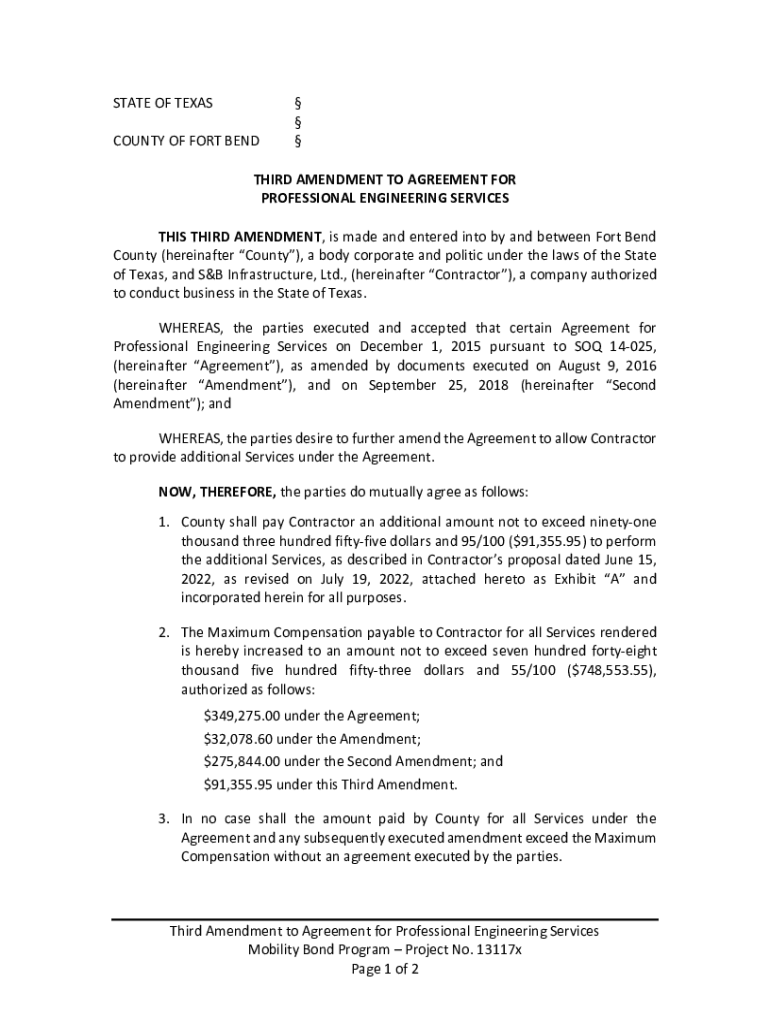 STATE OF TEXAS COUNTY OF FORT BEND THIRD AMENDMENT TO AGREEMENT FOR PROFESSIONAL ENGINEERING SERVICES THIS THIRD AMENDMENT, is made and entered into by and between Fort Bend County (hereinafter County),
