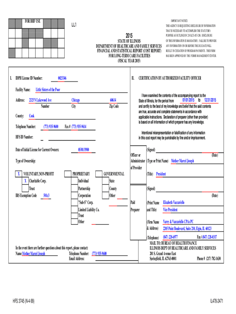 FOR BHF USELL1 2015 STATE OF ILLINOIS DEPARTMENT OF HEALTHCARE AND FAMILY SERVICES FINANCIAL AND STATISTICAL REPORT (COST REPORT) FOR LONGER CARE FACILITIES (FISCAL YEAR 2015)I.DPH License ID Number: