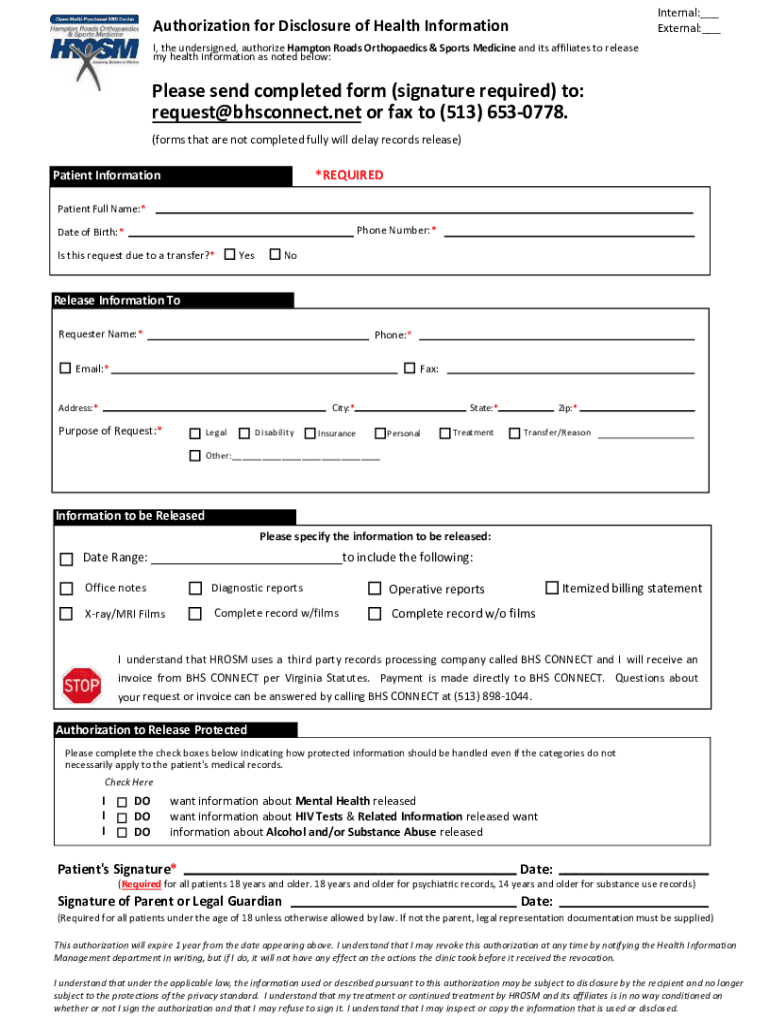 Internal:___ External:___Authorization for Disclosure of Health Information I, the undersigned, authorize Hampton Roads Orthopedics & Sports Medicine and its affiliates to release my health information