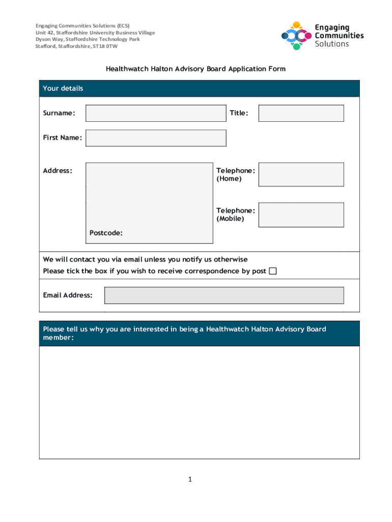 Engaging Communities Solutions (ECS) Unit 42, Staffordshire University Business Village Dyson Way, Staffordshire Technology Park Stafford, Staffordshire, ST18 0TWHealthwatch Halton Advisory Board