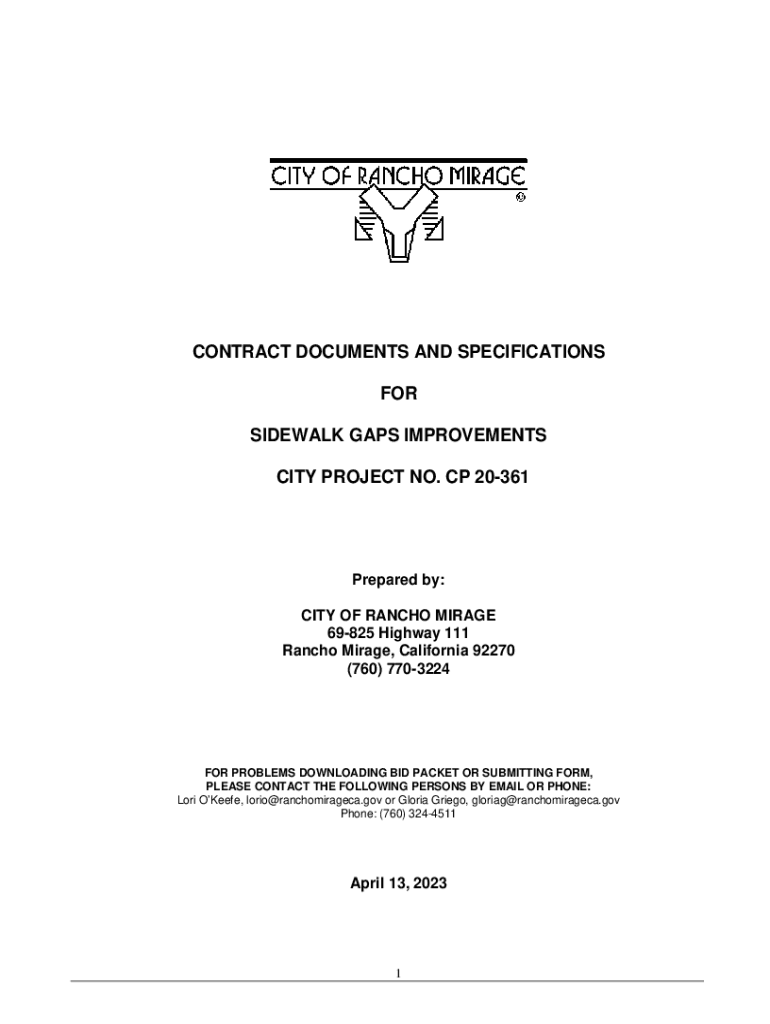 CONTRACT DOCUMENTS AND SPECIFICATIONS FOR SIDEWALK GAPS IMPROVEMENTS CITY PROJECT NO. CP 20361Prepared by: CITY OF RANCHO MIRAGE 69825 Highway 111 Rancho Mirage, California 92270 (760) 7703224FOR