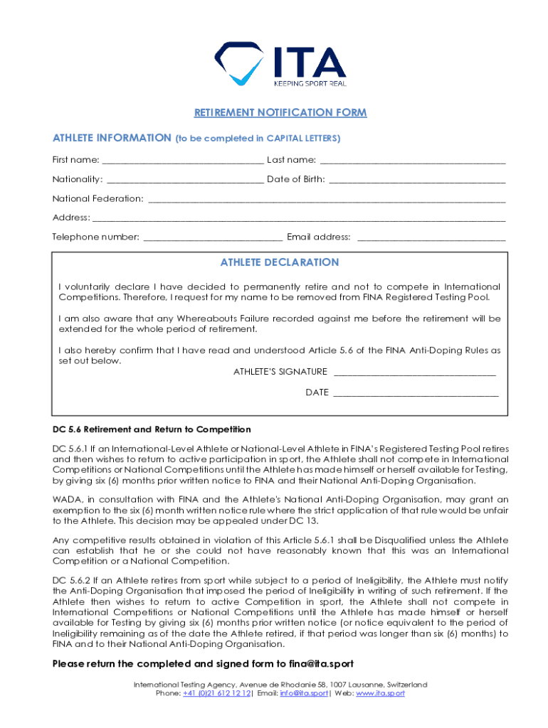 RETIREMENT NOTIFICATION FORM ATHLETE INFORMATION (to be completed in CAPITAL LETTERS) First name: ___ Last name: ___ Nationality: ___ Date of Birth: ___ National Federation: ___ Address: ___ Telephone