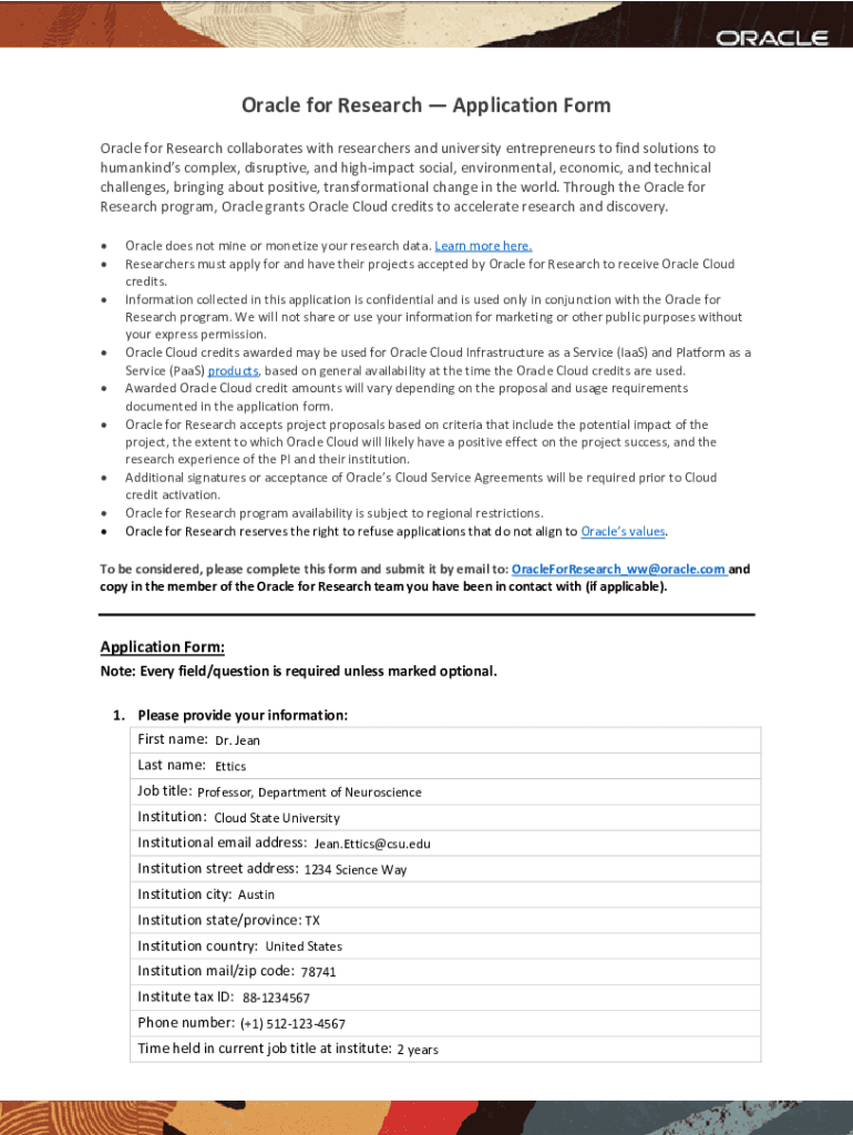 Oracle for Research Application Form Oracle for Research collaborates with researchers and university entrepreneurs to find solutions to humankind complex, disruptive, and high impact social, environmental,
