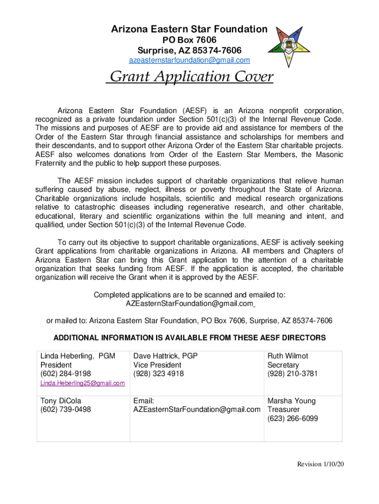 Arizona Eastern Star Foundation PO Box 7606 Surprise, AZ 853747606azeasternstarfoundation@gmail.comGrant Application Cover Arizona Eastern Star Foundation (AEF) is an Arizona nonprofit corporation,