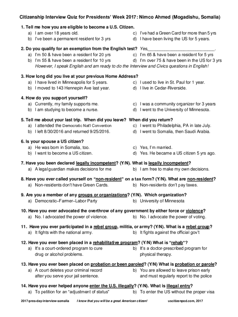 Citizenship Interview Quiz for Presidents Week 2017: Nico Ahmed (Mogadishu, Somalia) 1. Tell me how you are eligible to become a U.S. Citizen. a) I am over 18 years old. c) I've had a Green Card for