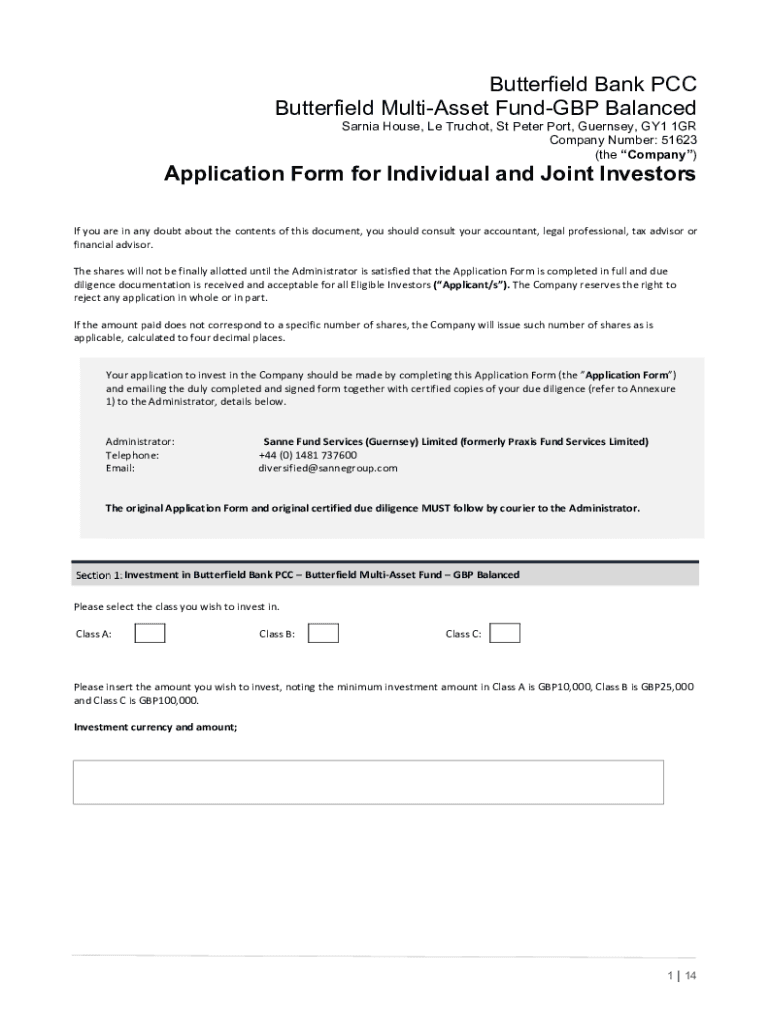 Butterfield Bank PCC Butterfield Multi-site Fund GBP Balanced Narnia House, Le Taught, St Peter Port, Guernsey, GY1 1GR Company Number: 51623 (the Company)Application Form for Individual and Joint
