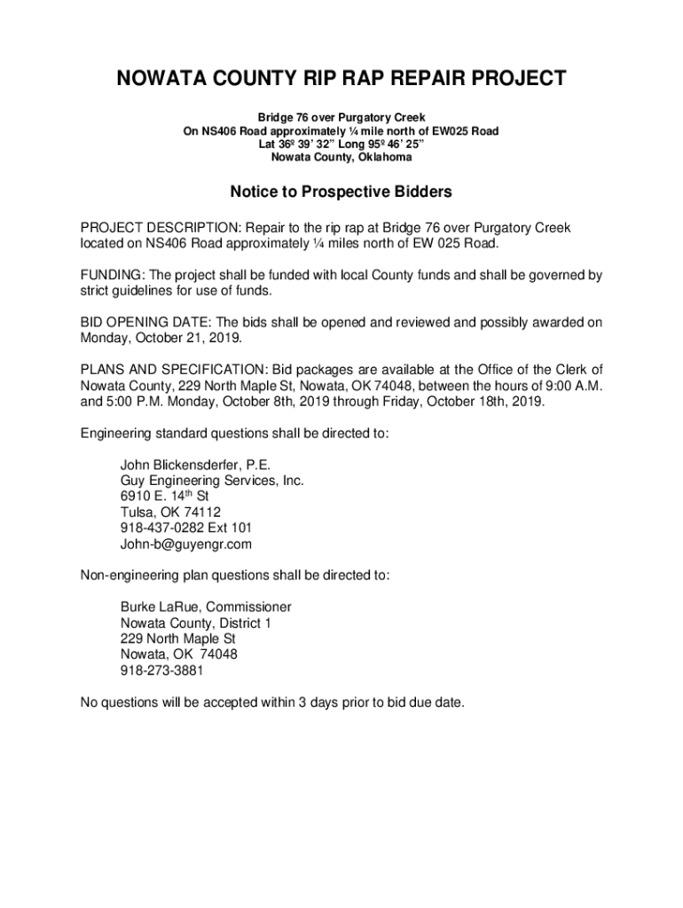 NOW ATA COUNTY RIP RAP REPAIR PROJECT Bridge 76 over Purgatory Creek On NS406 Road approximately mile north of EW025 Road Lat 36 39 32 Long 95 46 25 NOAA County, OklahomaNotice to Prospective Bidders