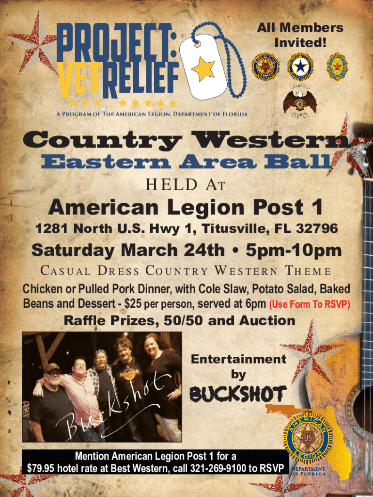 All Members Invited! Country Western Eastern Area Ball HELD At American Legion Post 11281 North U.S. Hwy 1, Titusville, FL 32796Saturday March 24th 5pm10pm Casual Dress Country Western Theme Chicken