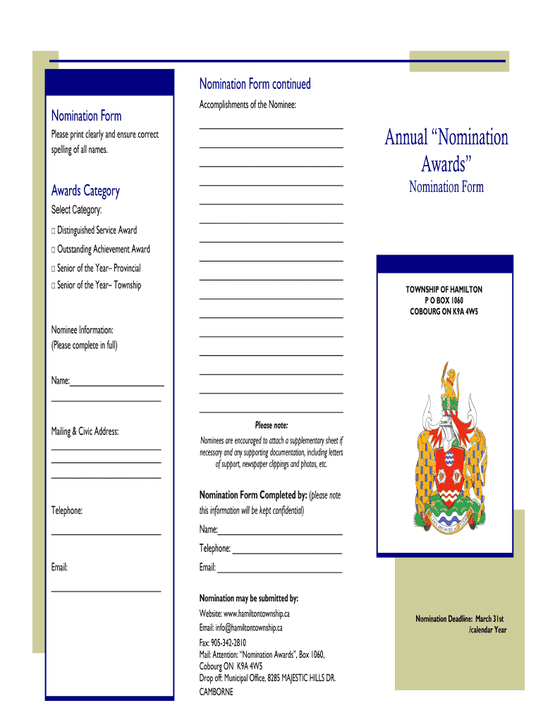 Nomination Form continued Nomination Form Please print clearly and ensure correct spelling of all names. Awards Category Select Category: ? Distinguished Service Award ? Outstanding Achievement Award