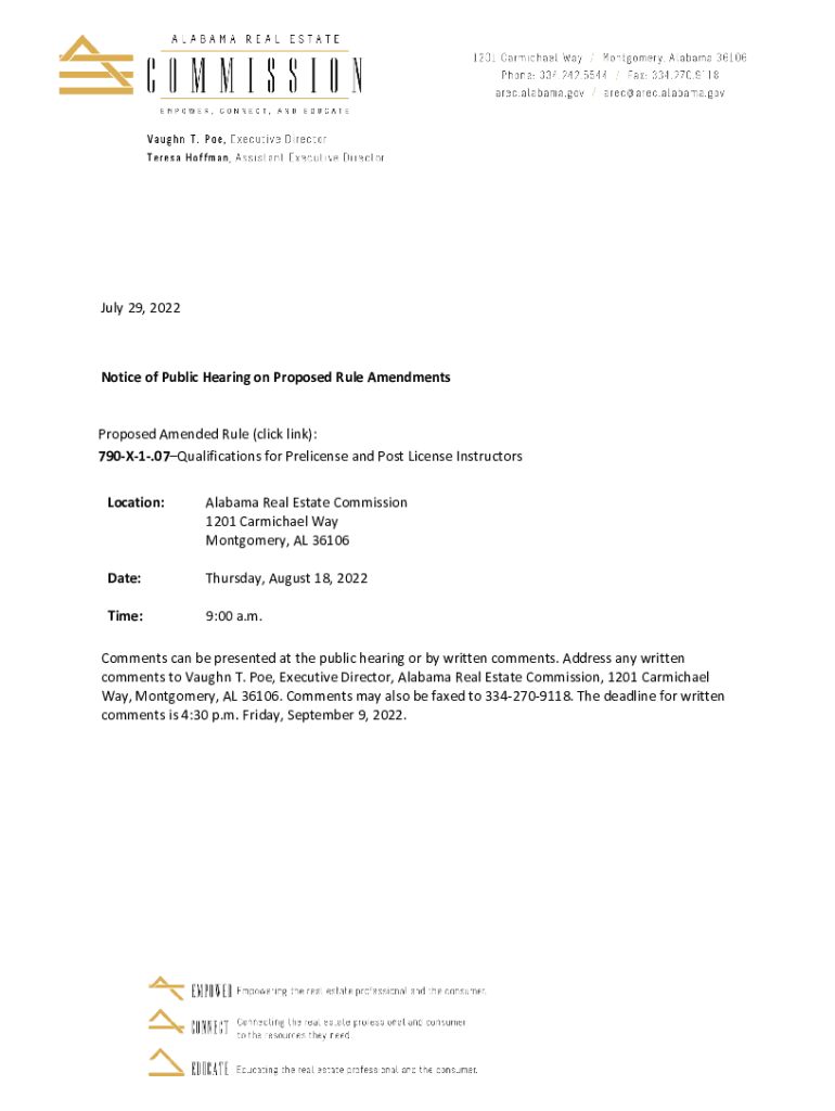 July 29, 2022Notice of Public Hearing on Proposed Rule AmendmentsProposed Amended Rule (click link): 790×1.07Qualifications for License and Post License Instructors Location:Alabama Real Estate Commission