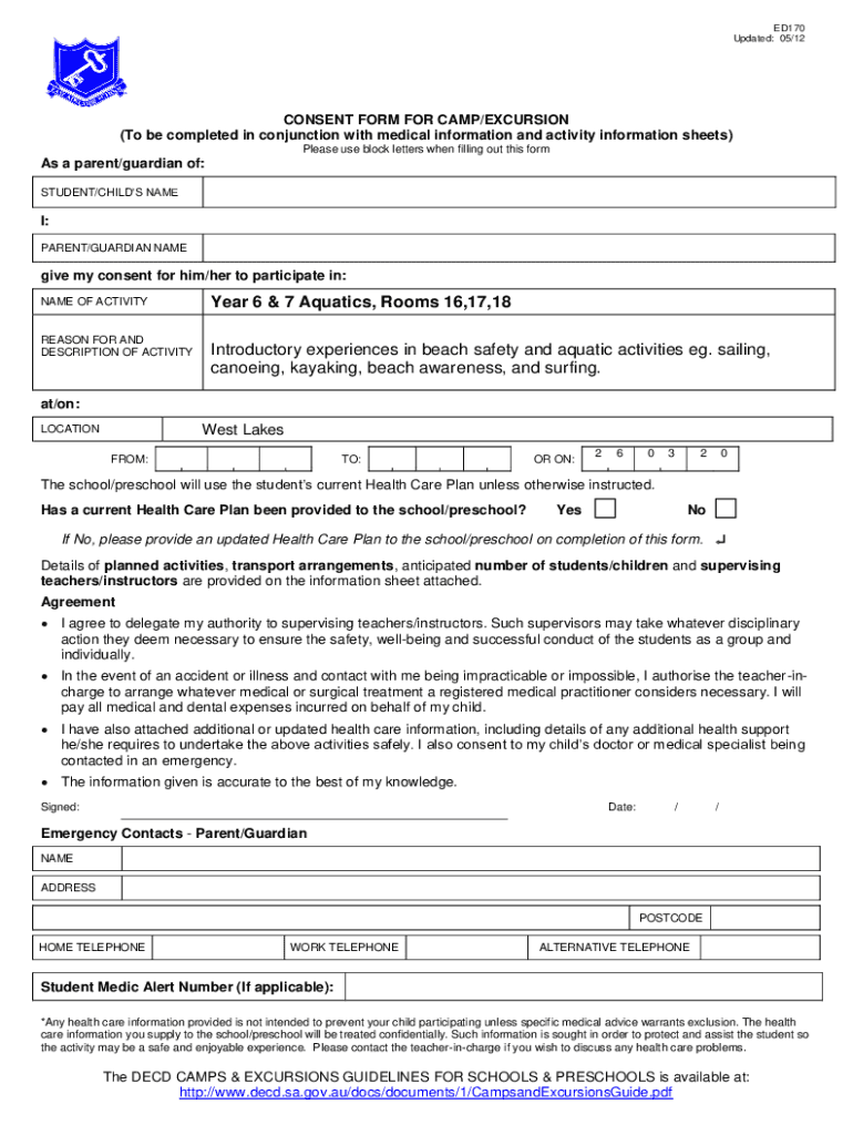 ED170 Updated: 05/12CONSENT FORM FOR CAMP/EXCURSION (To be completed in conjunction with medical information and activity information sheets) Please use block letters when filling out this format