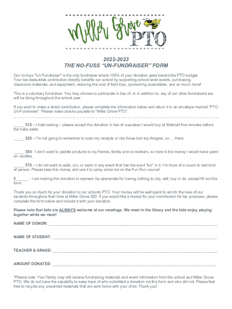 20222023 THE NOUNS FUNDRAISER FORM Our no fuss \” Fundraiser\” is the only fundraiser where 100% of your donation goes toward the PTO budget. Your tax-deductible contribution directly benefits
