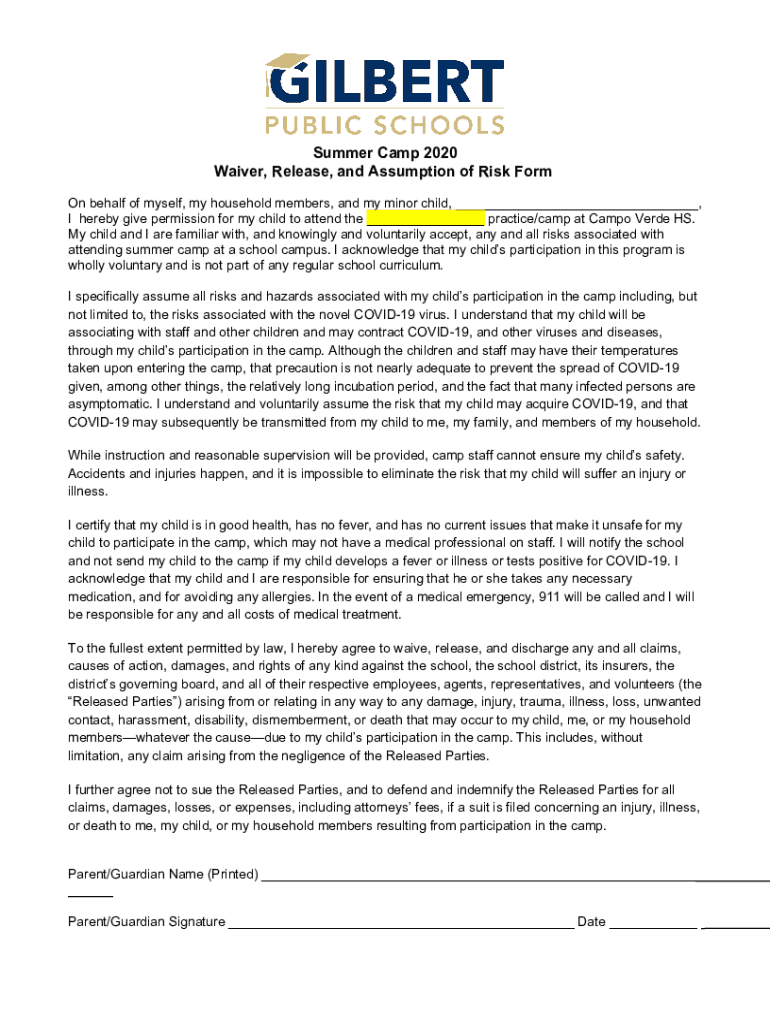 Summer Camp 2020 Waiver, Release, and Assumption of Risk Form On behalf of myself, my household members, and my minor child, ___, I hereby give permission for my child to attend the ___ practice/camp