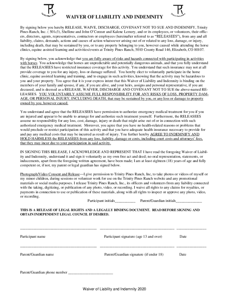 WAIVER OF LIABILITY AND INDEMNITY By signing below you hereby RELEASE, WAIVE, DISCHARGE, COVENANT NOT TO SUE AND INDEMNIFY, Trinity Pines Ranch, Inc. (501c3), Hellene and John O'Connor and Kale né