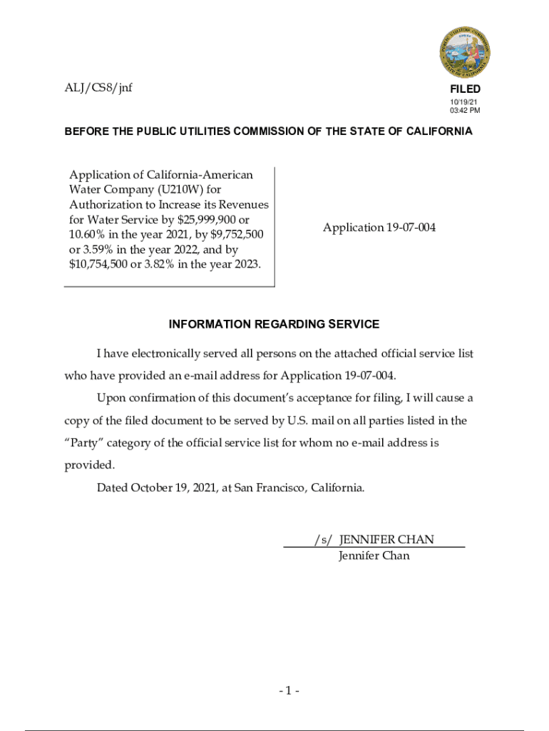ALJ/CS8/failed 10/19/21 03:42 BEFORE THE PUBLIC UTILITIES COMMISSION OF THE STATE OF CALIFORNIAApplication of California American Water Company (U210W) for Authorization to Increase its Revenues for
