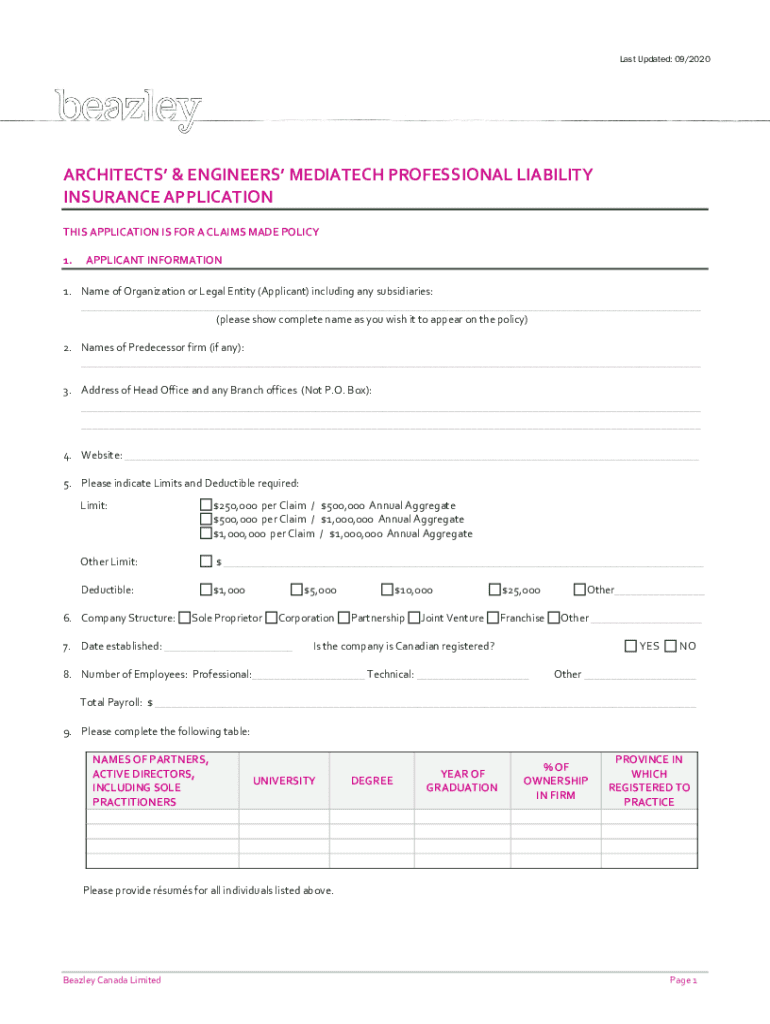 Last Updated: 09/2020ARCHITECTS & ENGINEERS MEDIATE CH PROFESSIONAL LIABILITY INSURANCE APPLICATION THIS APPLICATION IS FOR A CLAIMS MADE POLICY 1.APPLICANT INFORMATION1. Name of Organization or Legal