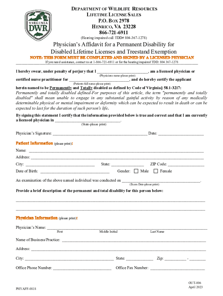 DEPARTMENT OF WILDLIFE RESOURCES LIFETIME LICENSE SALES P.O. BOX 2978 ENRICO, VA 23228 8667216911 (Hearing impaired call TDD# 8043671278)Physicians Affidavit for a Permanent Disability for Disabled