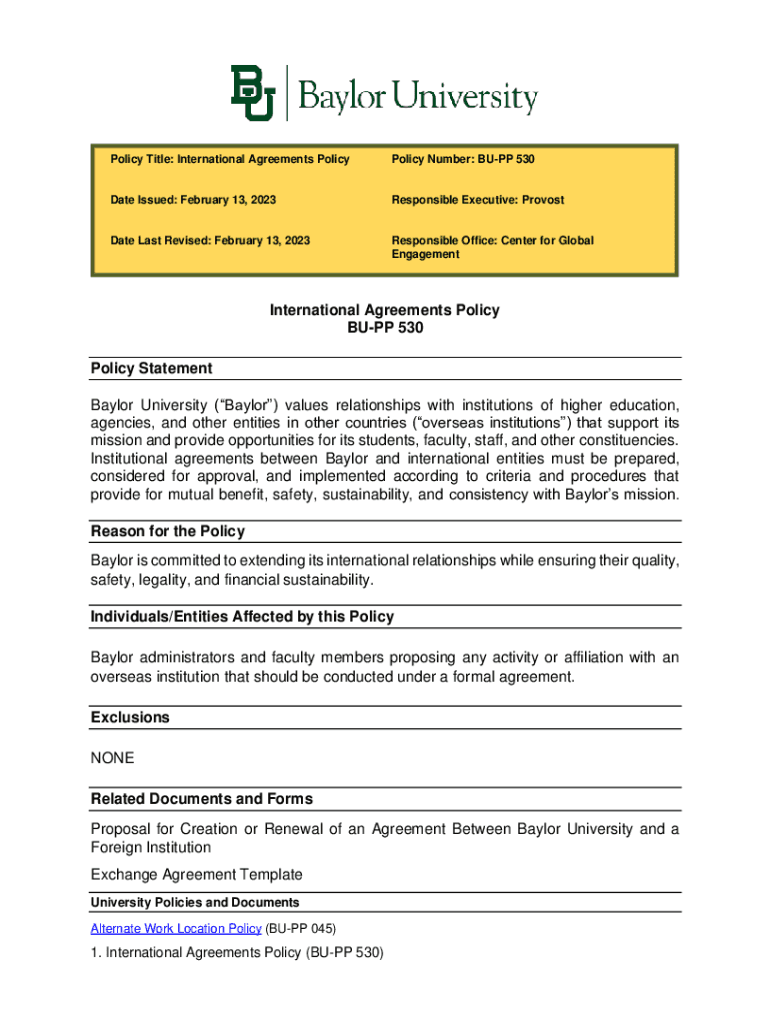 Policy Title: International Agreements PolicyPolicy Number: BUMP 530Date Issued: February 13, 2023Responsible Executive: Prostate Last Revised: February 13, 2023Responsible Office: Center for Global