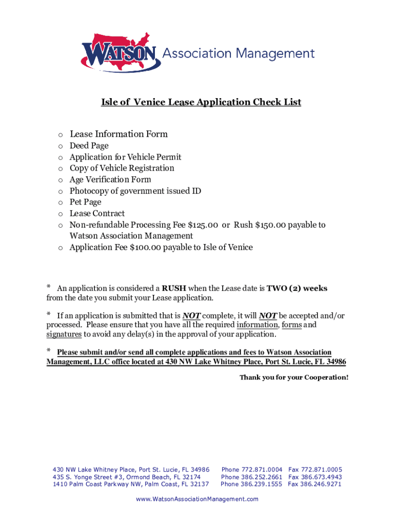 Isle of Venice Lease Application Check List o o o o o o o o please Information Formed Page Application for Vehicle Permit Copy of Vehicle Registration Age Verification Form Photocopy of government