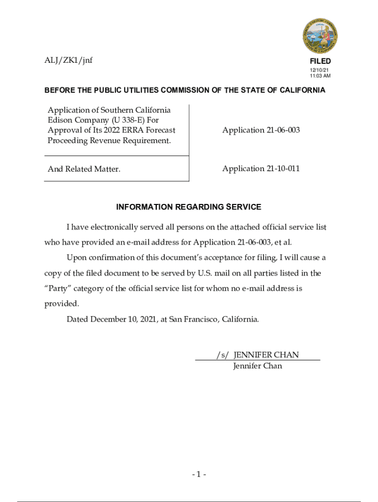 ALJ/ZK1/failed 12/10/21 11:03 BEFORE THE PUBLIC UTILITIES COMMISSION OF THE STATE OF CALIFORNIAApplication of Southern California Edison Company (U 338E) For Approval of Its 2022 ERA Forecast Proceeding