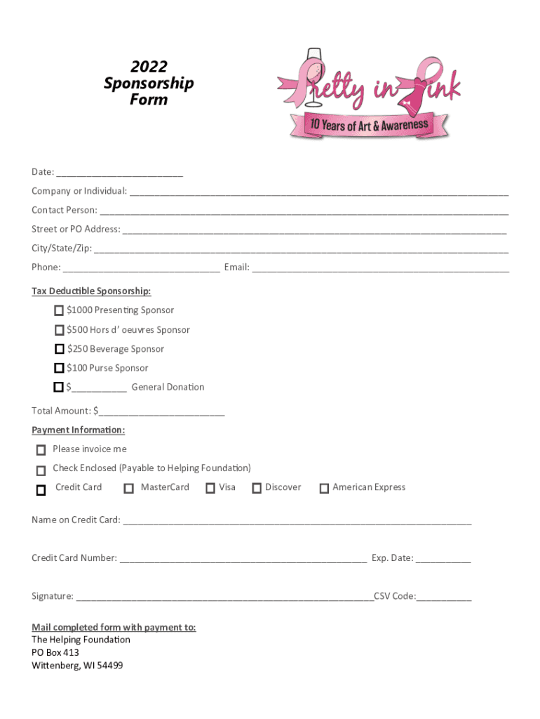 2022 Sponsorship Format: ___ Company or Individual: ___ Contact Person: ___ Street or PO Address: ___ City/State/Zip: ___ Phone: ___ Email: ___ Tax Deductible Sponsorship: $1000 Presenting Sponsor