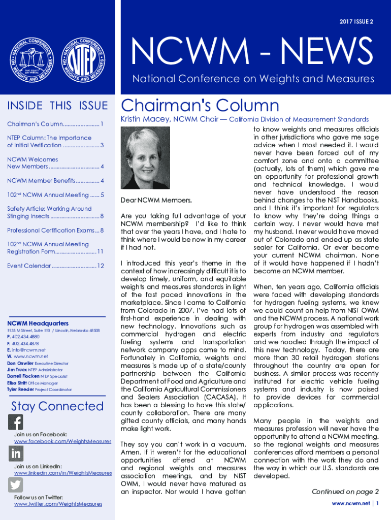 2017 ISSUE 2NCWM NEWS National Conference on Weights and MeasuresINSIDE THIS ISSUE Chairman Column........................ 1Chairman\'s Column Kristin Malay, NCM Chair California Division of Measurement